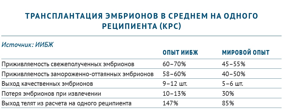 Подсаживая один эмбрион к предварительно осемененной корове, в первый год нам удалось увеличить выход телят до 140% на количество используемых реципиентов. В следующем году – до 147%, получив при этом практически 1,5 теленка из расчета на одного использованного реципиента. Также мы добились приживляемости свежеполученных эмбрионов на уровне 60–70% (при мировом опыте в 45–55%) и замороженно-оттаянных – на уровне 58–60% (при мировом опыте в 40–50%, а в большинстве случаев еще ниже).