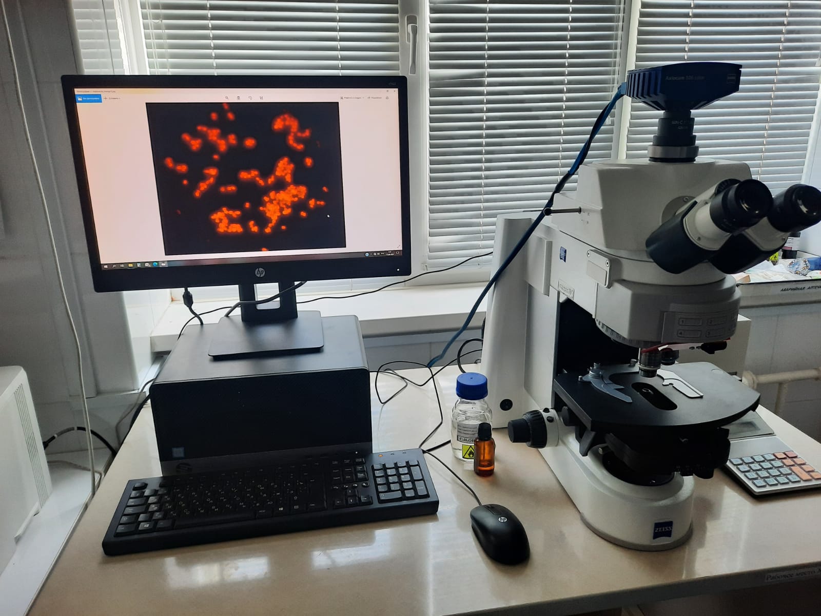В работе был использован люминесцентный микроскоп AxioImager D2 (Германия). В качестве флуорохрома применяли красители «акридиновый желтый» и «акридиновый оранжевый» в виде 0,1% метанольного раствора при 30-секундной экспозиции без дополнительной фиксации мазков с последующим промыванием в дистиллированной воде и высушиванием их в токе воздуха.