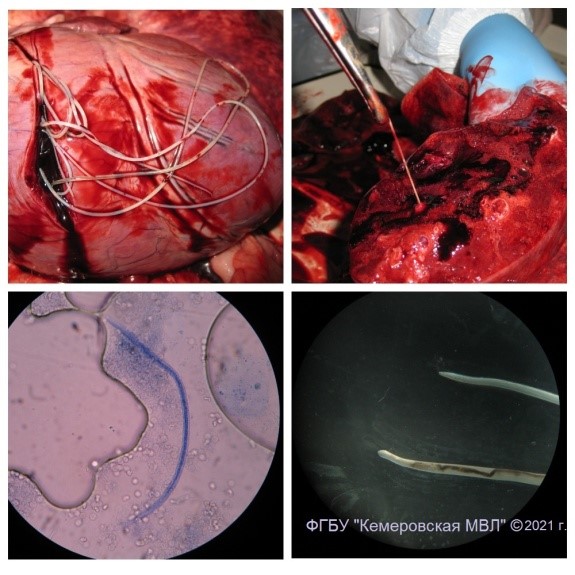 При проведении патологоанатомического вскрытия были обнаружены следующие патологические изменения: взрослые особи дирофилярий в правой половине сердца и в сосудах легких; двусторонняя серозная пневмония; застойная гиперемия и отек легких; очаговая альвеолярная эмфизема легких; легочной эндартериит; кровоизлияния в легких и на слизистой оболочке толстого кишечника; фиброз печени; дистрофия миокарда, печени и почек; эрозивно-язвенный гастрит с кровотечением в полость желудка; катаральный энтероколит; серозный лимфанодулит брыжеечных лимфоузлов; застойная гиперемия конъюнктивы, печени и почек.
