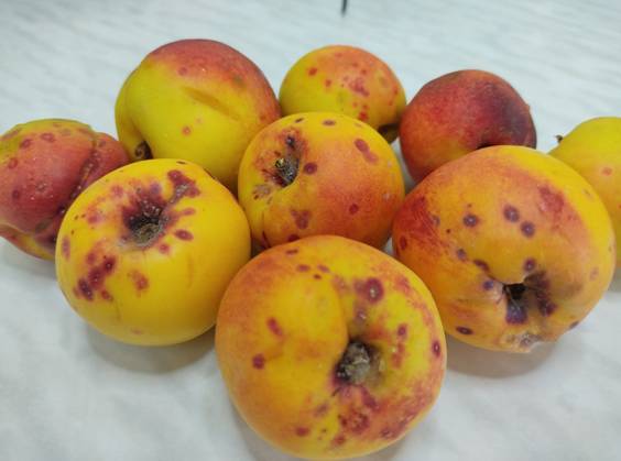 Основными симптомами повреждения на плодах калифорнийской щитовкой являются образование красных пятен. Поврежденные плоды остаются недоразвитыми, теряют свой товарный вид.