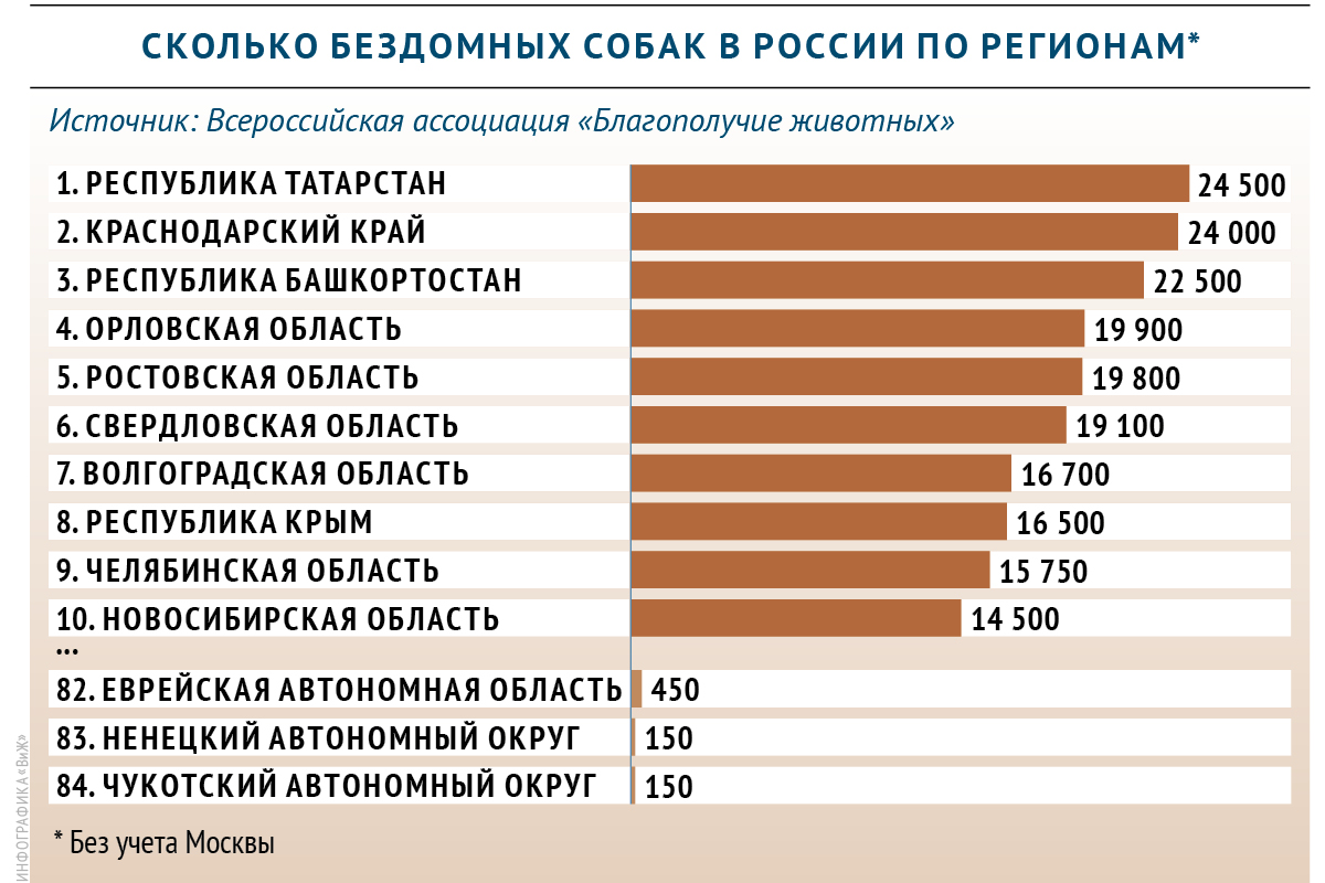 А начнем с цифр. По данным Всероссийской ассоциации «Благополучие животных», в регионах (без учета Москвы) проживает более 660 тыс. бездомных собак. В топ-3 антирейтинга входят Татарстан (24,5 тыс.), Краснодарский край (24 тыс.) и Башкортостан (22,5 тыс.). Много это или мало? Цифр, которые можно однозначно назвать критическими, не существует. А значит, определить масштабы бедствия в каждом регионе сложно. Однако биолог Владимир Рыбалко, специалист по экологии бездомных собак, руководитель Первого петрозаводского общественного приюта для собак и кошек, член движения «Реалистическая зоозащита», считает, что такой порог все же есть, и он очевиден.