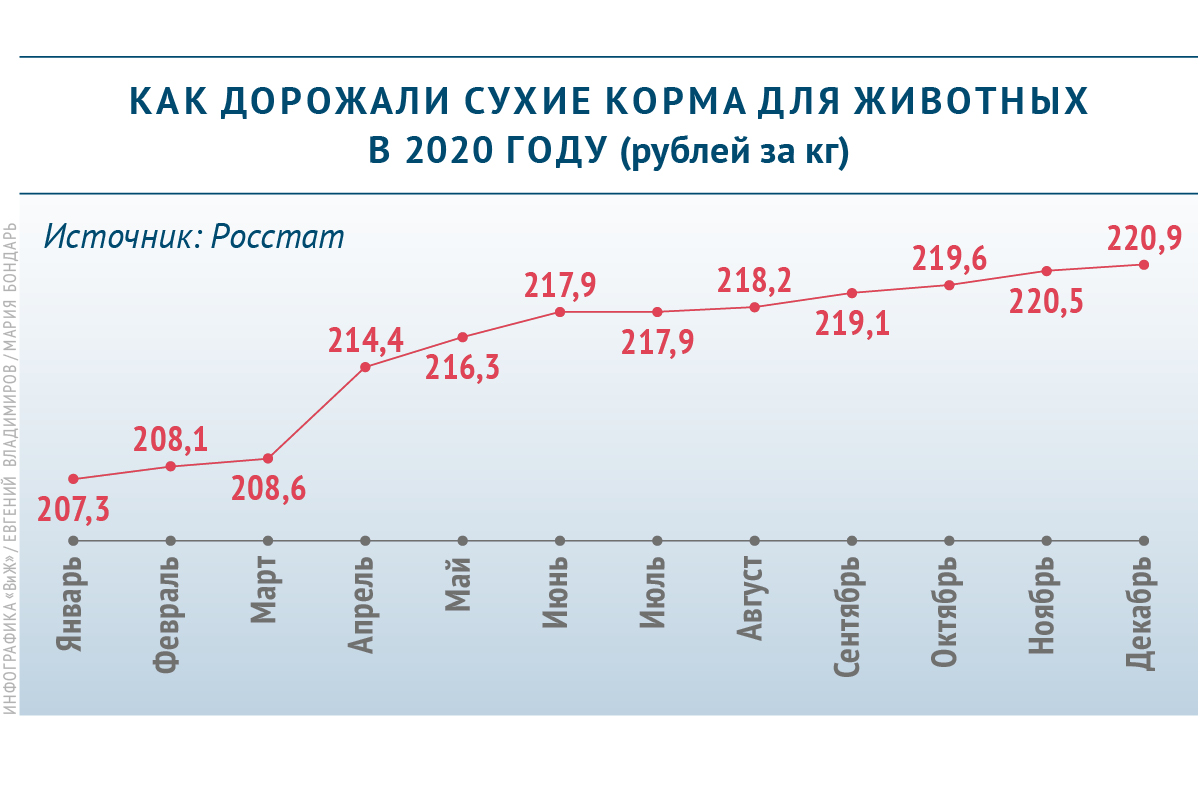Официальная статистика не ведет учет цен на все корма для домашних животных, только на сухие, которые хотя и стоят дешевле, но только на них долго не протянешь. Вместе с тем цены и на эту категорию товаров для животных росли с каждым новым месяцем прошедшего года. По данным Росстата, в целом по России цены на сухие корма для домашних животных с января по декабрь 2020 года выросли на 6,5% – с 207,3 до 220,85 рубля за килограмм. Почти такими же темпами дорожали корма и в Москве, где за год цена на сухие корма возросла на 6,4% – до 257,84 рубля.