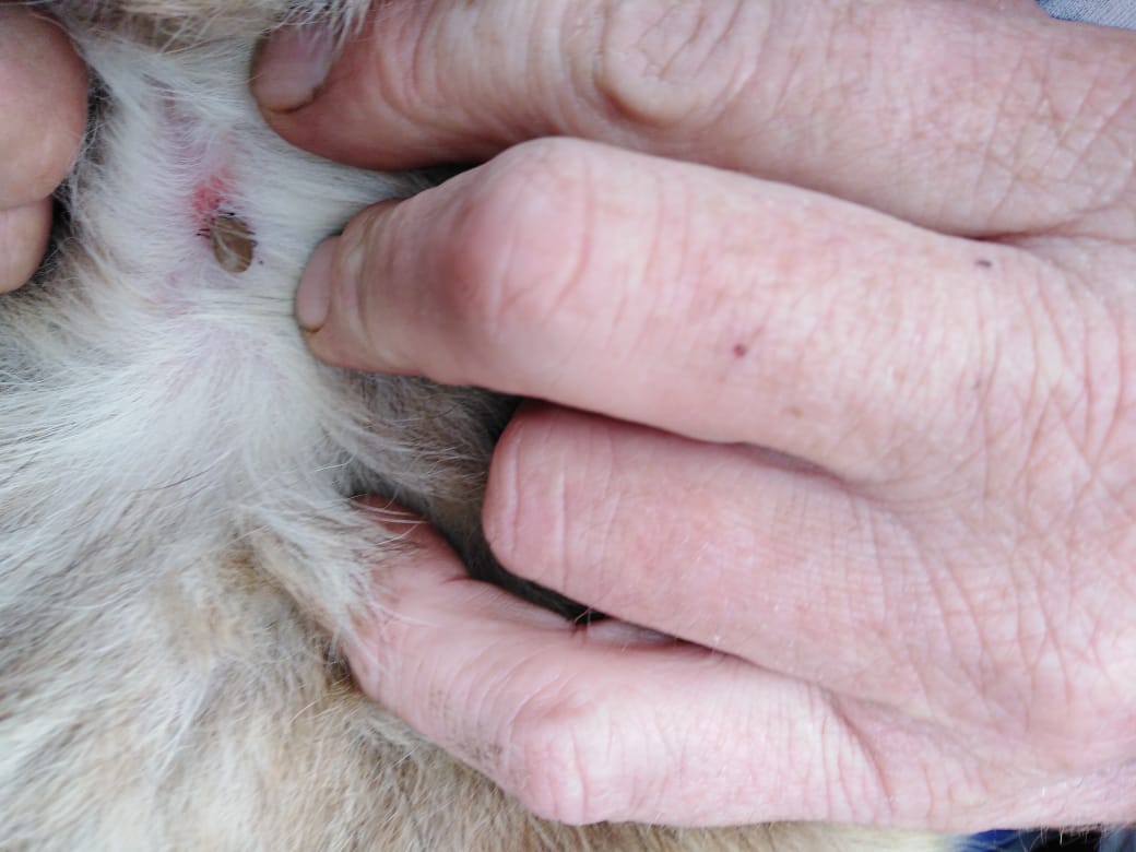 — место укуса следует обработать. Но, лучше обработку провести не зелёнкой или йодом, а прозрачными дезинфицирующими жидкостями: спиртом, спиртсодержащими жидкостями или хлоргексидином для того, чтобы после ветеринарный специалист смог компетентно осмотреть рану и, если это требуется удалить остатки клеща;