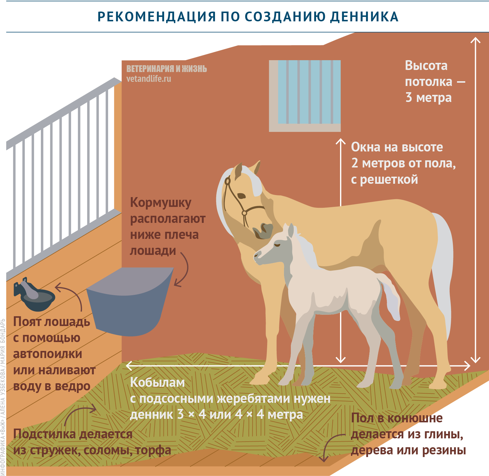 · В деннике – отгороженном помещении в конюшне, которое предназначено для содержания животного без привязи, – должно быть просторно. Стандартный размер денника 3 × 3 метра. Крупные лошади будут чувствовать себя комфортнее в деннике 3 × 4 метра. Кобылам с подсосными жеребятами желательно обеспечить денник размером 4 × 4 метра.