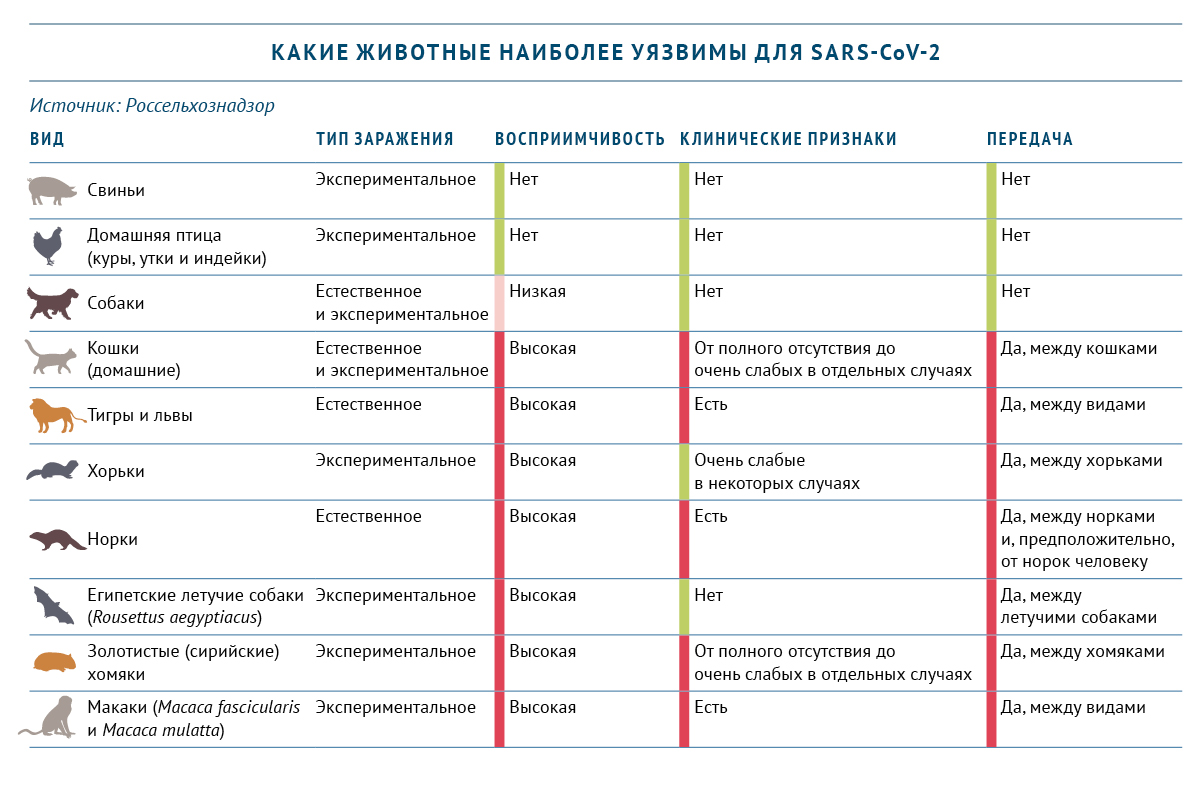 Напомним, что сообщения о заражении различных животных (домашних, диких, зоопарковых) поступили во Всемирную организацию здравоохранения животных (МЭБ) из 27 стран. К новому коронавирусу восприимчивы практически все кошачьи, собаки, куньи (норки и хорьки), человекообразные обезьяны.