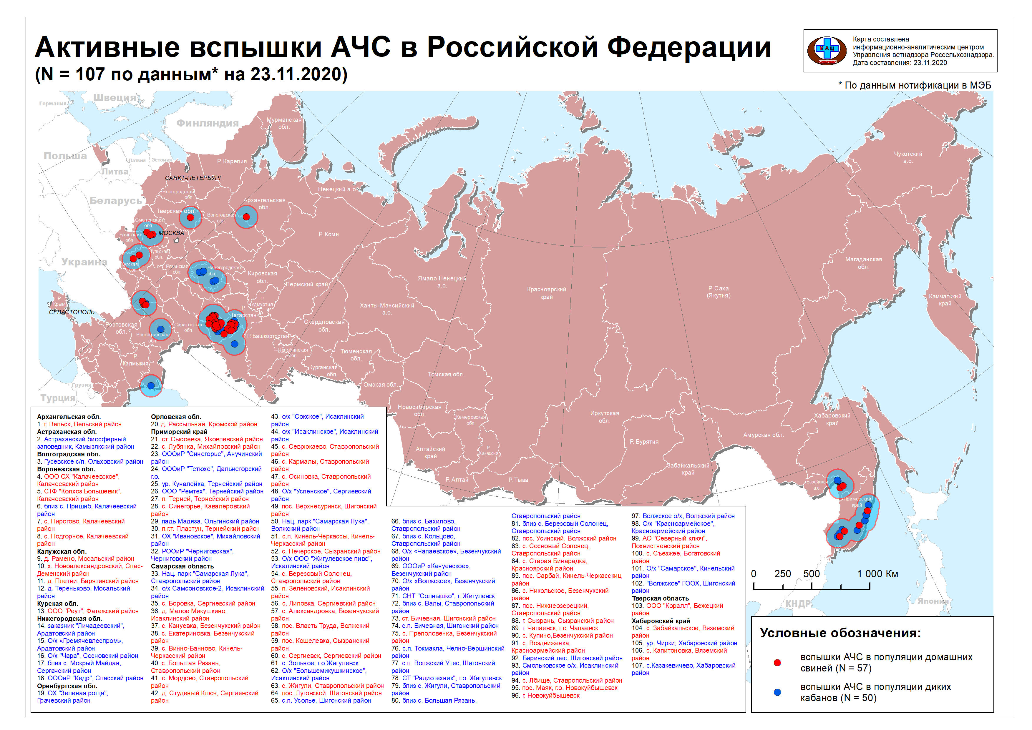 С начала января по 19 ноября 2020 года в России зарегистрировано 235 вспышек АЧС, из них 84 – среди диких кабанов, 151 – среди домашних свиней в хозяйствах разных форм собственности.