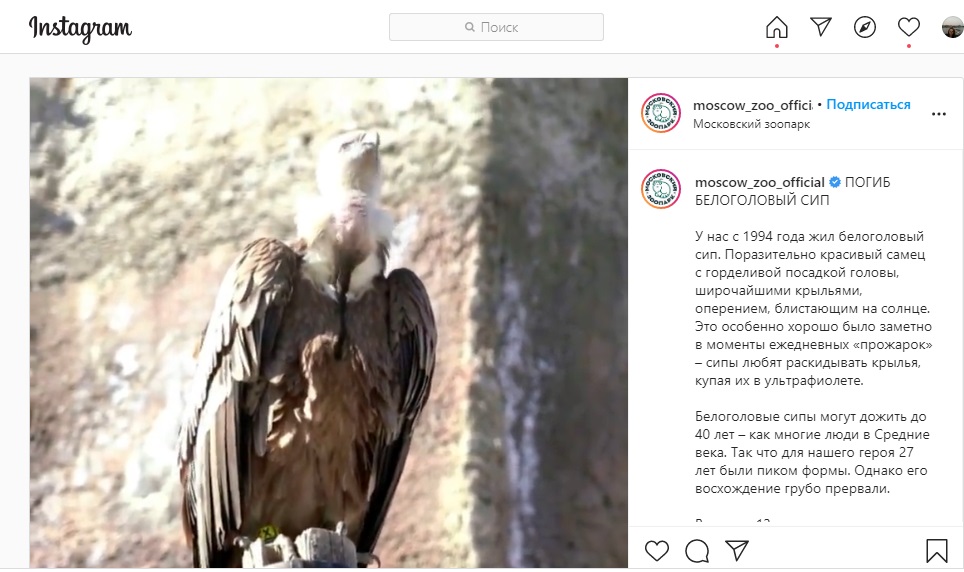 В Московском зоопарке белоголовый сип жил с 1994 года, он умер в возрасте 27 лет. При этом, как добавили в зоопарке, в неволе сипы могут жить до 40 лет.